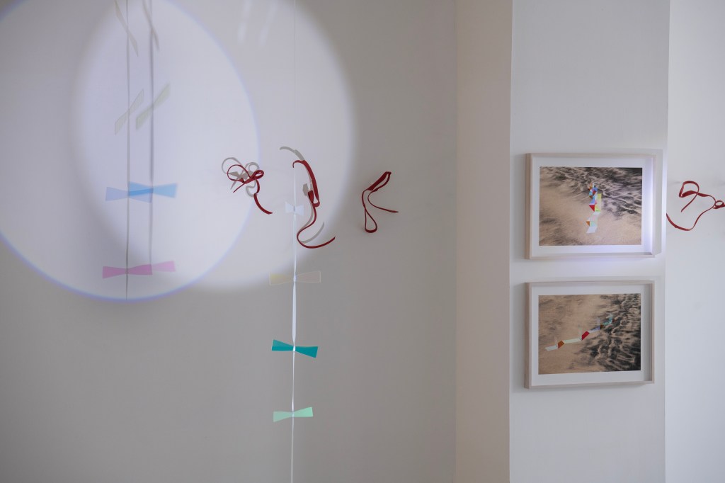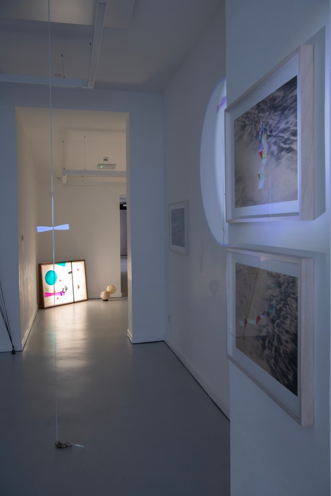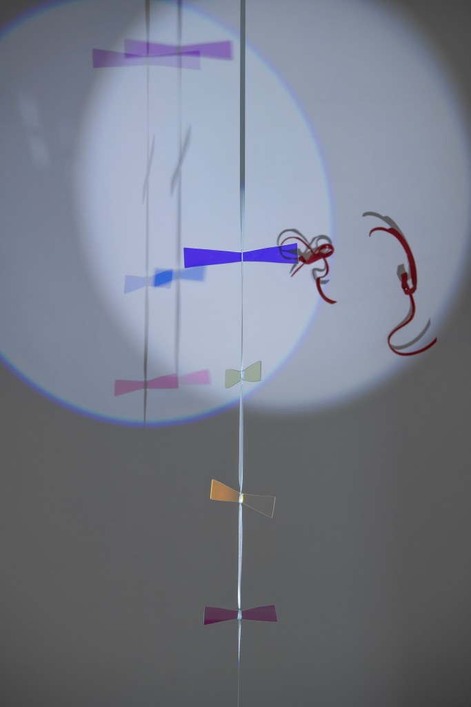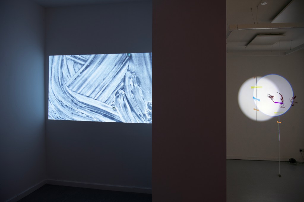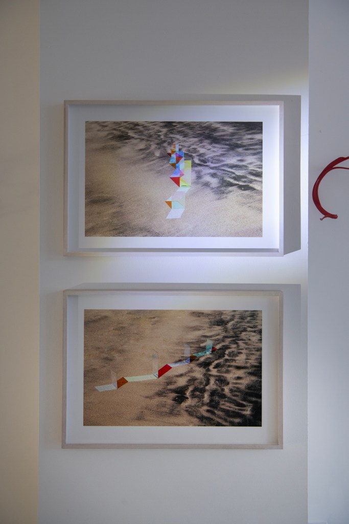 All three artists share a love of water, light and reflection. Patterson and Pailing both live close to the North Sea; Maurer was born in Portsmouth and lived for many years on a canal. All three are fascinated by simplicity, and draw on everyday materials in their work. Patterson gathers driftwood and discarded objects from the tideline, presenting them in sparse arrangements which reference both the industrial background of the sea and the respect for space and position found in ‘Ikebana’, the Japanese art of flower arrangement. His compositions bring out the dignity of working objects. Pailing, too, repurposes waste from the processes of making, whether fabric or vinyl, glass or household items such as bedsprings and window blinds, which she connects and transforms, using craft techniques such as stitching, wrapping and weaving, to create new work. Maurer endeavours to find a poetic narrative in relationships between objects at different scales, shining light through glass, filming through lenses, projecting onto a beach or a flexible screen. In my work, too, I explore scale and perspective, and often draw on collage techniques, assembling the bric-a-brac of found speech and sense observations from the North Sea beaches where I walk and fill endless notebooks.