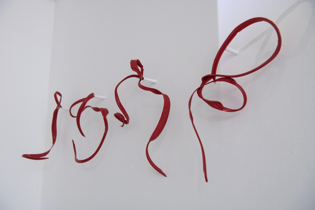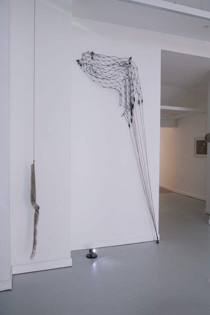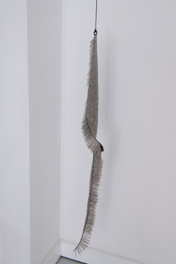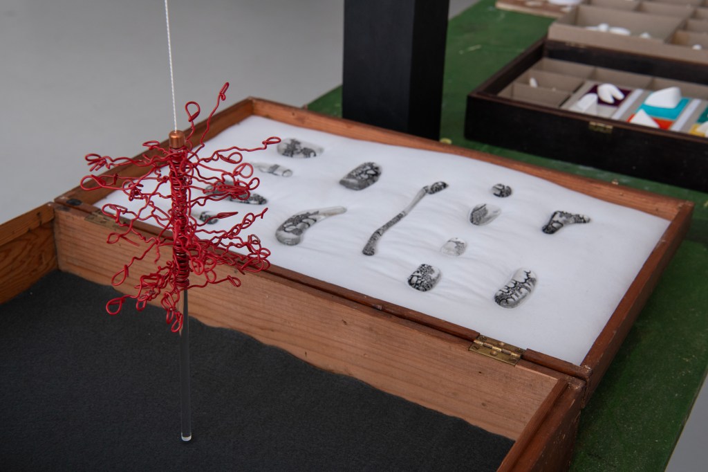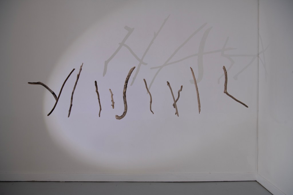 From the conversation between the three artists’ work, new ideas emerge. There is a juxtaposition of worlds, old and new. Patterson’s animated sticks and reclaimed objects are bare bones creating new life forms in shadow. Pailing’s vinyl offcuts become at once primitive squirming creatures, and a kind of calligraphy. In her hands old bedsprings, draped gracefully, transform into a discarded fishing net, and become in turn a sea creature’s tentacles. A scrap of frayed nylon rope, suspended, becomes a delicate prehistoric sea-slug. Within a discarded seashell trinket case, Maurer’s glass water-word beads become secrets whispered into ears. In reanimating abandoned objects, all three artists are preoccupied by anthropogenic effects on our environment. Pailing coats wire in graphite, its matt black referencing the carbon upon which organic life depends and from which fossil fuels derive.