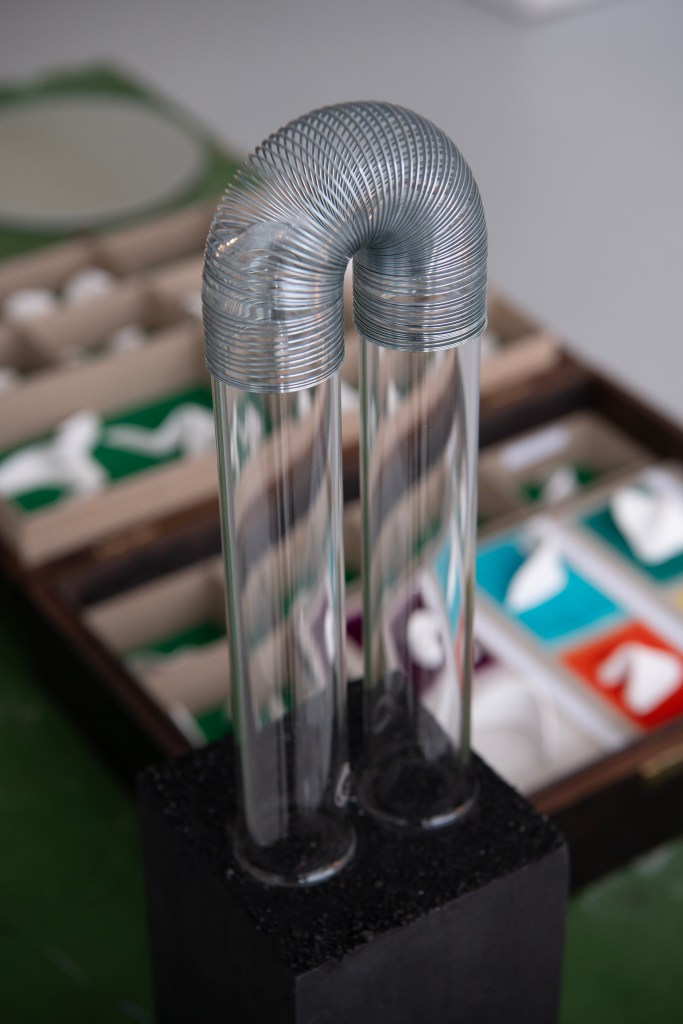 Play is the key to all these works, and childhood objects are often the inspiration. For Pailing, a Slinky toy suggests an electromagnetic coil, a child’s Spirograph drawing a bedspring. The pin, which takes on a meditative quality when multiplied a thousand-fold, was once bent by a child to form a fish-hook. Maurer’s glass pebbles, used as marbles by children, create their own internal landscapes, seen differently from many angles. Where she has incorporated fragments of my text in these pebbles, and in glass powder, the words contract into bubble writing or break down into their smallest parts, potentially becoming something else entirely – perhaps something tactile, like Braille. ‘I thought if fish could speak,’ she writes playfully, ‘perhaps that might be how their hand writing might look.’